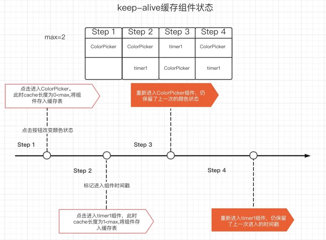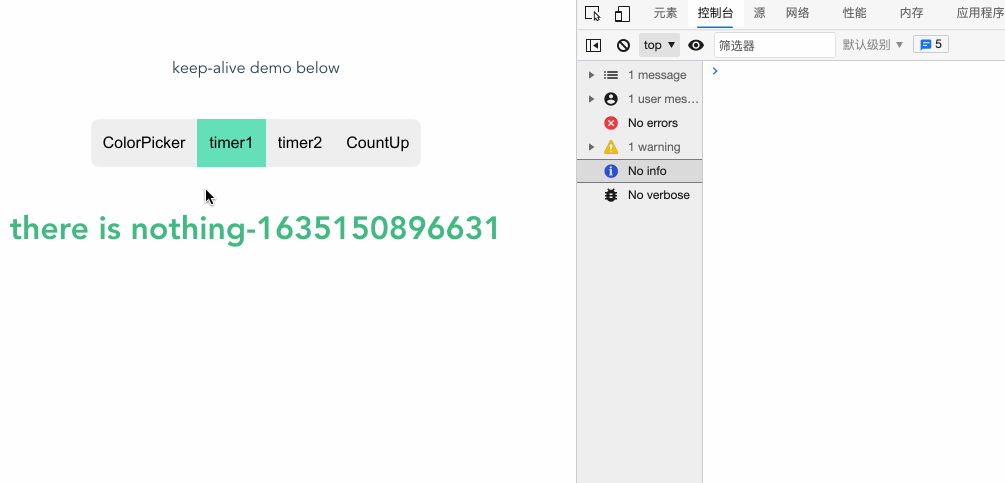 // index.vue<script setup>import { ref } from "vue"import CountUp from '../components/CountUp.vue'import ColorRandom from '../components/ColorRandom.vue'import Timer from '../components/Timer.vue'const tabs = ref([ // 组件列表 { title: "ColorPicker", comp: ColorRandom, }, { title: "timer1", comp: Timer, }, { title: "timer2", comp: Timer, }, { title: "CountUp", comp: CountUp, },])const currentTab = ref(tabs.value[0]) // tab 默认展示第一个组件const tabSwitch = (tab) => { currentTab.value = tab}</script><template> <div id="main-page">keep-alive demo below</div> <div class="tab-group"> <button v-for="tab in tabs" :key="tab" :class="['tab-button', { active: currentTab === tab }]" @click="tabSwitch(tab)" > {{ tab.title }} </button> </div> <keep-alive max="2"> <!-- 动态组件渲染 tab 当前的组件 --> <component v-if="currentTab" :is="currentTab.comp" :key="currentTab.title" : /> </keep-alive></template>缓存状态