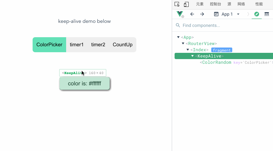 通过观察 vue devtools 里节点的变化,可以看到此时 keepAlive 中包含了 ColorRandom 和 Timer 两个组件,当前展示的组件会处在 activated 的状态,而其他被缓存的组件则处在 inactivated 的状态