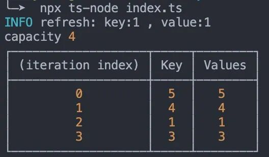 // ./LRU.tsexport class LRUCache { capacity: number; // 容量 cache: Map<number, number | null>; // 缓存 constructor(capacity: number) { this.capacity = capacity; this.cache = new Map(); } get(key: number): number { if (this.cache.has(key)) { let temp = this.cache.get(key) as number; //访问到的 key 若在缓存中,将其提前 this.cache.delete(key); this.cache.set(key, temp); return temp; } return -1; } put(key: number, value: number): void { if (this.cache.has(key)) { this.cache.delete(key); //存在则删除,if 结束再提前 } else if (this.cache.size >= this.capacity) { // 超过缓存长度,淘汰最近没使用的 this.cache.delete(this.cache.keys().next().value); console.log(`refresh: key:${key} , value:${value}`) } this.cache.set(key, value); } toString(){ console.log('capacity',this.capacity) console.table(this.cache) }}// ./index.tsimport {LRUCache} from './lru'const list = new LRUCache(4)list.put(2,2) // 入 2,剩余容量3list.put(3,3) // 入 3,剩余容量2list.put(4,4) // 入 4,剩余容量1list.put(5,5) // 入 5,已满 从头至尾 2-3-4-5list.put(4,4) // 入4,已存在 ——> 置队尾 2-3-5-4list.put(1,1) // 入1,不存在 ——> 删除队首 插入1 3-5-4-1list.get(3) // 获取3,刷新3——> 置队尾 5-4-1-3list.toString()// ./index.tsimport {LRUCache} from './lru'const list = new LRUCache(4)list.put(2,2) // 入 2,剩余容量3list.put(3,3) // 入 3,剩余容量2list.put(4,4) // 入 4,剩余容量1list.put(5,5) // 入 5,已满 从头至尾 2-3-4-5list.put(4,4) // 入4,已存在 ——> 置队尾 2-3-5-4list.put(1,1) // 入1,不存在 ——> 删除队首 插入1 3-5-4-1list.get(3) // 获取3,刷新3——> 置队尾 5-4-1-3list.toString()结果如下: