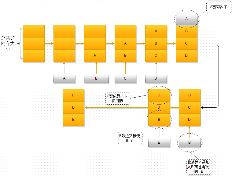 当 E 组件被访问时,内存空间不足,C 变成最久未使用的组件,C 组件从缓存中删除,E 组件加入到最新的位置