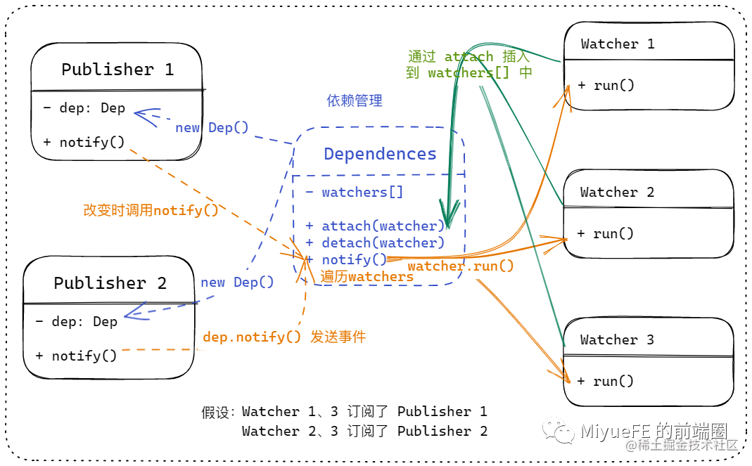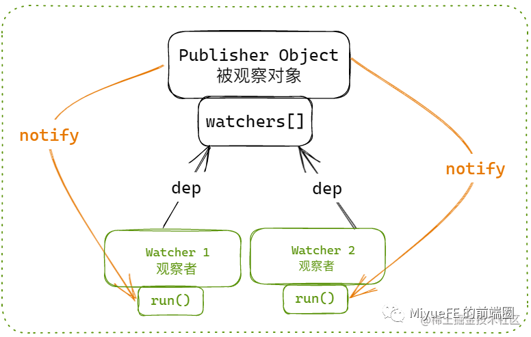 虽然 Vue 2 与 Vue 3 实现响应式系统的方式不同,但是他们的核心思想还是一致的,都是通过 发布 - 订阅模式 来实现(因为发布者和观察者之间多了一个 dependence 依赖收集者,与传统观察者模式不同)。