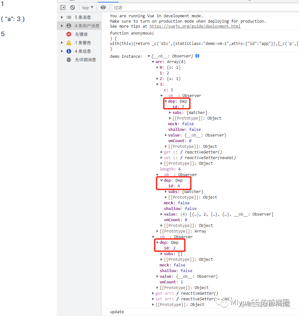 <body> <div id="app" class="demo-vm-1"> <p>{{arr[0]}}</p> <p>{{arr[2]}}</p> <p>{{arr[3].c}}</p> </div></body><script> new Vue({ el: "#app", data() { return { arr: [1, 2, { a: 3 },{ c: 5 }] } }, mounted() { console.log("demo Instance: ", this.$data); setTimeout(() => { console.log('update') this.arr[0] = { o: 1 } this.arr[2] = { a: 1 } },2000) }, })</script>因为数组元素的前三个元素 在定义时都是简单类型,所以即使在模板中使用了该数据,也无法进行依赖收集和更新响应: