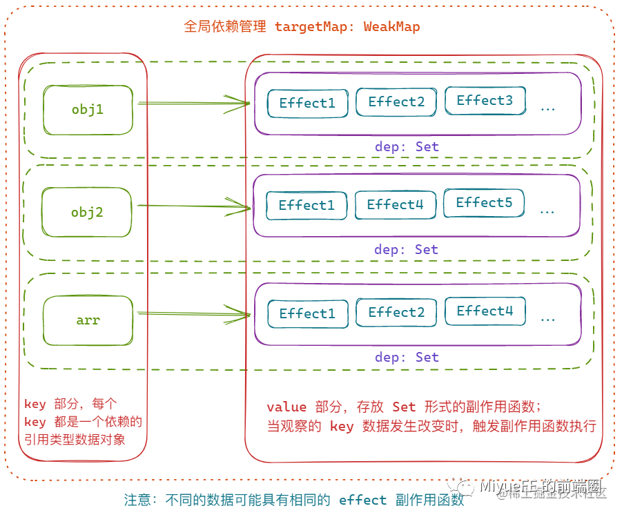 Dep实例来保存每个对象所关联的Watcher数组,然后更新时遍历执行,那么 Vue 3 是不是也是这么操作的呢?