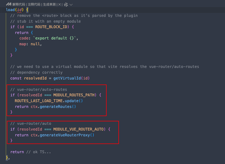 - load 钩子: 当构建工具请求加载虚拟模块时,插件根据配置生成实际的路由配置代码。
