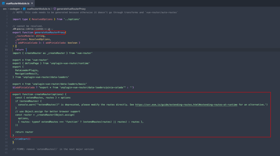 unplugin-vue-router 的核心之一是动态生成 Vue Router 的代理模块。该模块会导出 vue-router 的所有 API,并扩展 createRouter 方法以包含自动生成的路由配置: