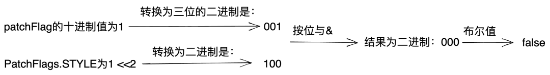 同理将patchFlag转换为三位的二进制后是 001。PatchFlags.STYLE为1 << 2,转换为二进制值为 100。001 和 100 进行 &(按位与) 操作,计算下来的值为 000。所以patchFlag & PatchFlags.CLASS转换为布尔值后为 false,说明当前 p 标签不是动态 style 标签。如下图: