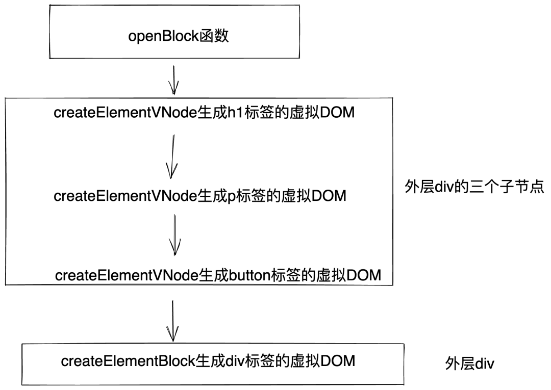 我们先来搞清楚 render 函数中的那一堆嵌套函数的执行顺序,我们前面已经讲过了首先会执行返回的括号中的第一项openBlock函数,然后再执行括号中的第二项createElementBlock函数。createElementBlock函数是一个层层嵌套的结构,执行顺序是内层先执行,外层再执行。所以接下来会先执行里层createElementVNode生成 h1 标签的虚拟 DOM,然后执行createElementVNode生成 p 标签的虚拟 DOM,最后执行createElementVNode生成 button 标签的虚拟 DOM。内层的函数执行完了后再去执行外层的createElementBlock生成 div 标签的虚拟 DOM。如下图: