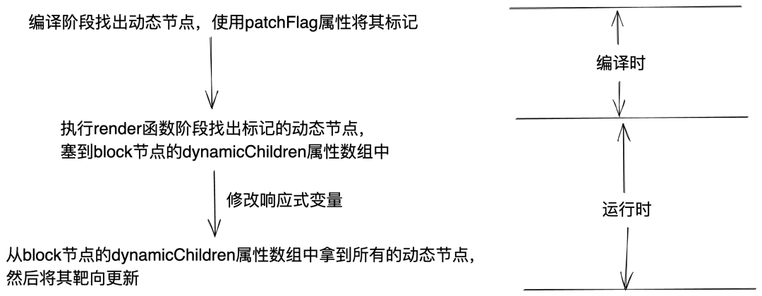 后续更新视图执行patch函数时只需要拿到根节点的dynamicChildren属性,就可以拿到 DOM 树中的所有动态子节点。