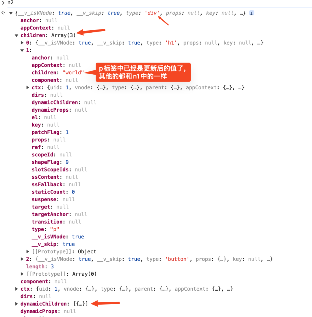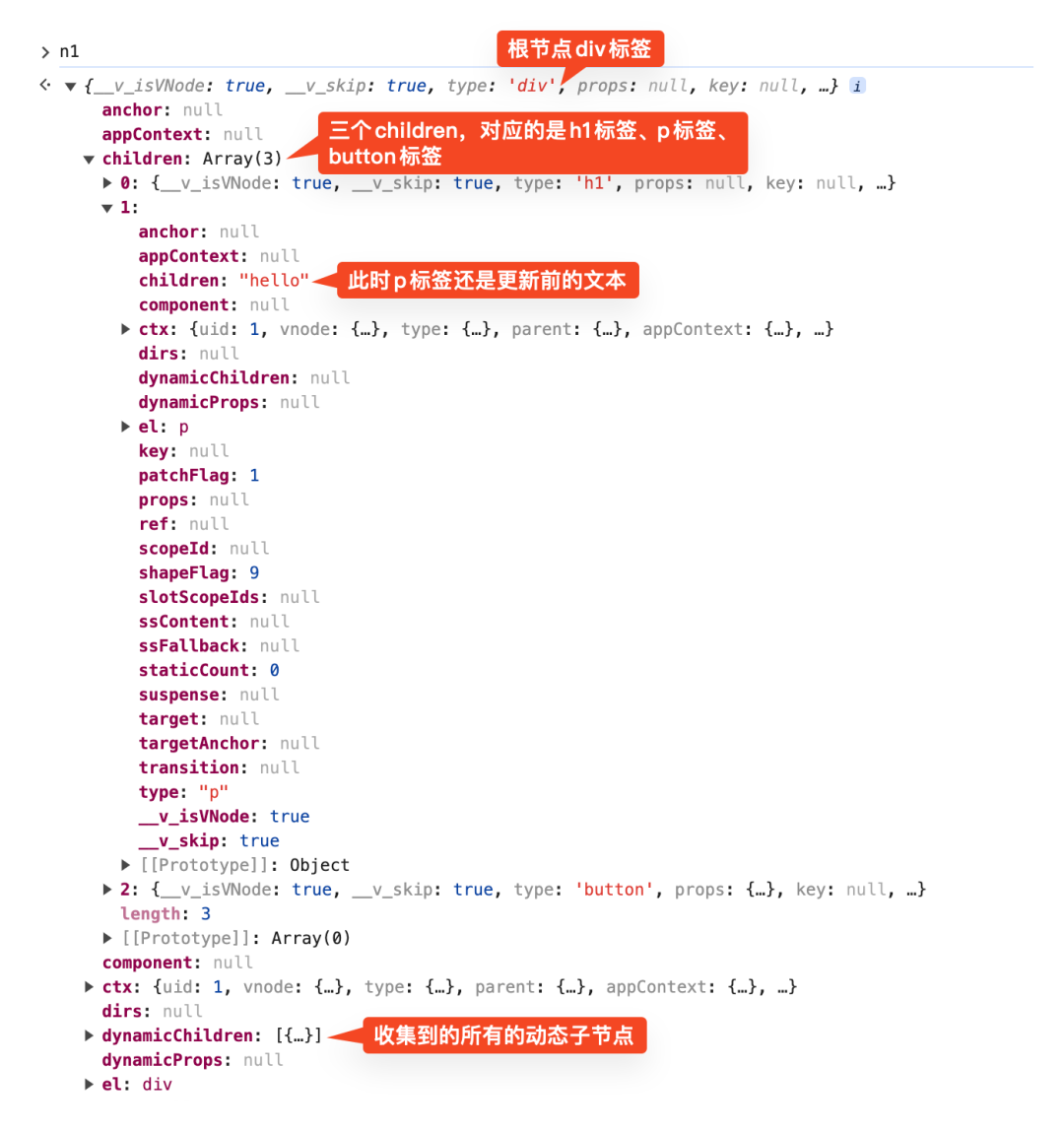 从上面可以看到此时的 n1 为根 block 节点,此时 p 标签中的文本还是更新前的文本 "hello",dynamicChildren属性为收集到的所有动态子节点。
