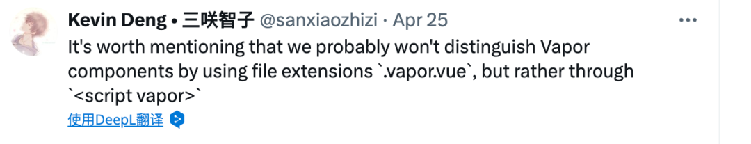 在实验阶段的Vue Vapor中已经抛弃了虚拟 DOM,更多关于Vue Vapor的内容可以查看我之前的文章: 没有虚拟 DOM 版本的 vue(Vue Vapor)。根据 vue 团队成员三咲智子 所透露未来将使用<script vapor>的方式去区分 Vapor 组件和目前的组件。