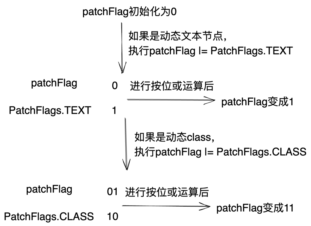 }由于一个节点可能同时是:动态文本节点、动态 class 节点、动态 style 节点。所以patchFlag中需要包含这些信息。