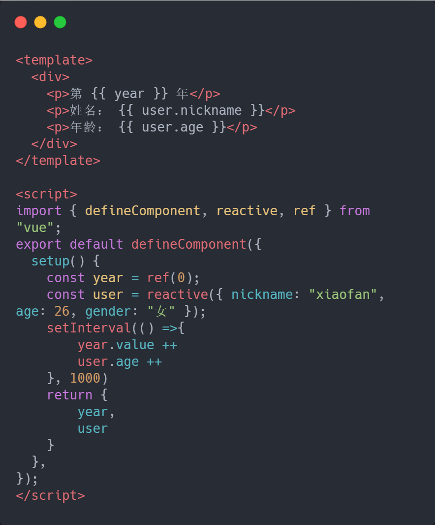 <template> <div class="homePage"> <p>第 {{ year }} 年</p> <p>姓名: {{ nickname }}</p> <p>年龄: {{ age }}</p> </div></template><script>import { defineComponent, reactive, ref ,toRefs} from "vue";export default defineComponent({ setup() { const year = ref(0); const user = reactive({ nickname: "xiaofan", age: 26, gender: "女" }); setInterval(() =>{ year.value ++ user.age ++ }, 1000) return { year, // 使用reRefs ...toRefs(user) } },});</script>生命周期钩子