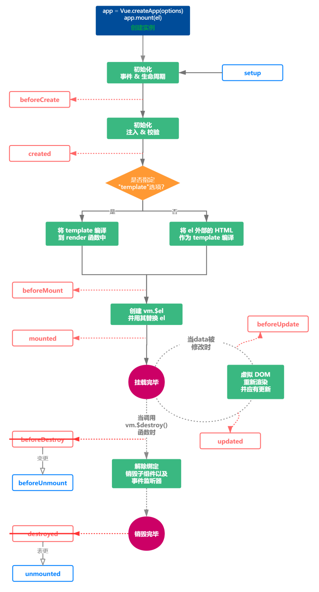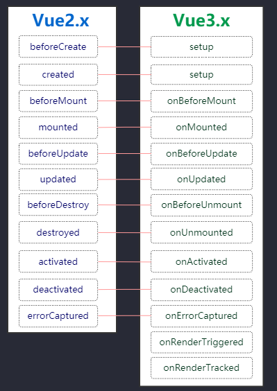 从图中我们可以看到 Vue3.0 新增了setup,这个在前面我们也详细说了, 然后是将 Vue2.x 中的beforeDestroy名称变更成beforeUnmount; destroyed 表更为 unmounted,作者说这么变更纯粹是为了更加语义化,因为一个组件是一个mount和unmount的过程。其他 Vue2 中的生命周期仍然保留。