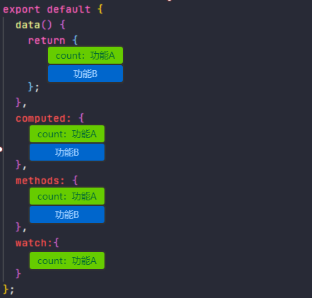 <template> <div class="homePage"> <p>count: {{ count }}</p> <p>倍数: {{ multiple }}</p> <div> <button style="margin-right:10px" @click="increase">加1</button> <button @click="decrease">减一</button> </div> </div></template><script>export default { data() { return { count: 0, }; }, computed: { multiple() { return 2 * this.count; }, }, methods: { increase() { this.count++; }, decrease() { this.count++; }, },};</script>上面代码只是实现了对count的加减以及显示倍数, 就需要分别在 data、methods、computed 中进行操作,当我们增加一个需求,就会出现下图的情况: