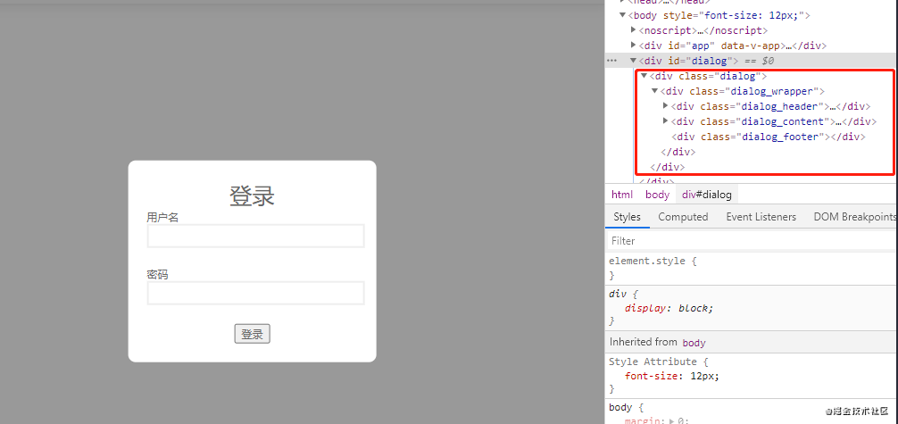 <div class="header"> ... <navbar />+ <Dialog v-if="dialogVisible"></Dialog></div>...Dom 渲染效果如下: