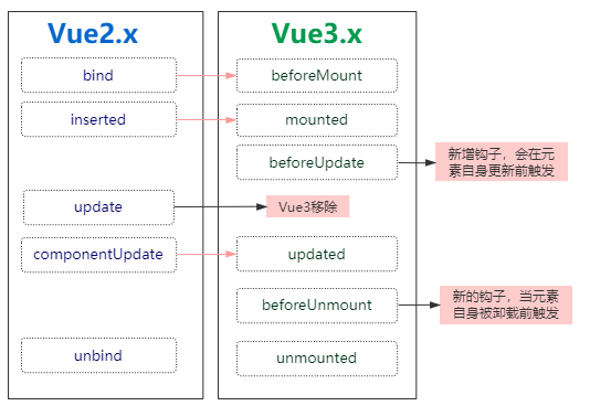 在 Vue 3 中对自定义指令的 API 进行了更加语义化的修改, 就如组件生命周期变更一样, 都是为了更好的语义化, 变更如下: