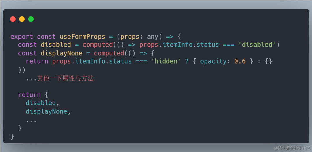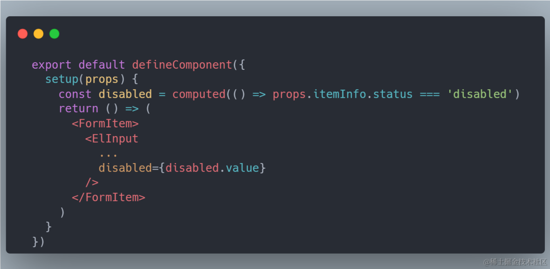 可以看到,每个组件都有个共性,有个配置项 status 如果值为 disabled 的时候,会被赋值到组件上,要是有很多组件,我们都得复制一下这个代码,那就比较恶心了,这个时候我们就可以用自定义 hooks 去封装这个属性:
