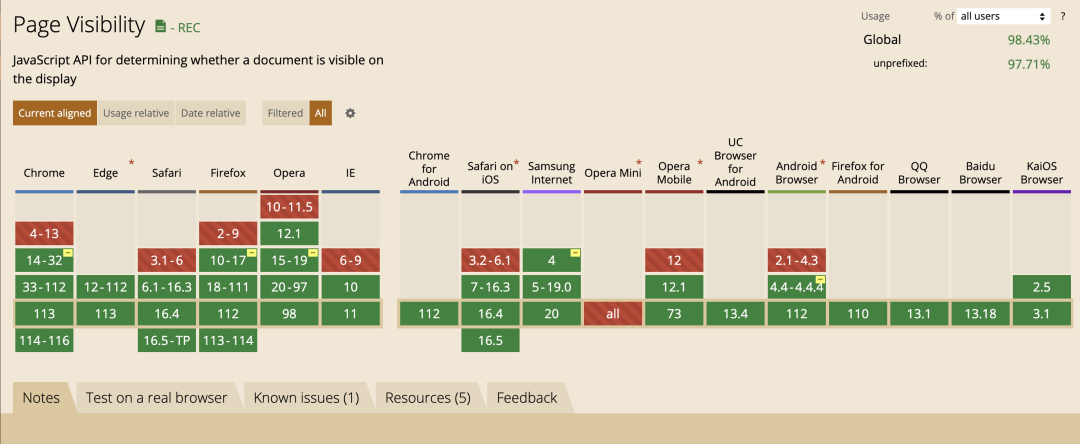 Page Visibility API 并不是所有浏览器都支持,我们需要在使用之前检查浏览器是否支持该 API。以下是一些浏览器的支持情况: