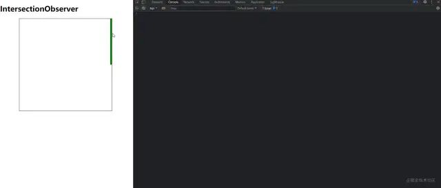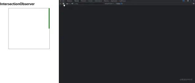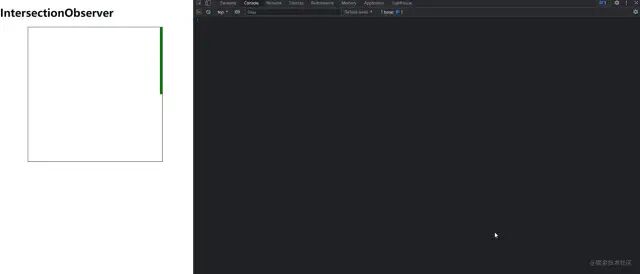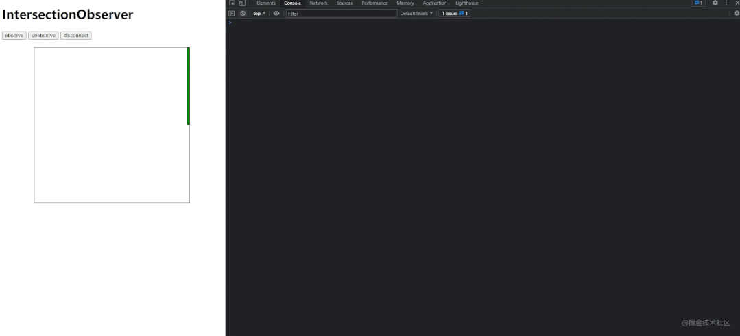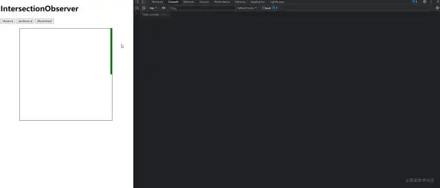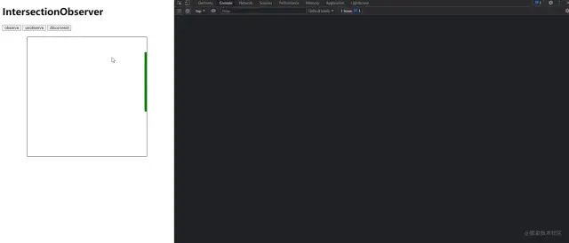 const myObserver = new IntersectionObserver(callback, options); myObserver.disconnect()当我们不想监测任何一个目标元素时,我们需要手动调用 disconnect 方法停止监听工作。通过动图可以看到,当我们点击 disconnect 按钮后,控制台不再输出 log ,说明监听工作已经停止,可以通过 observe 再次开启监听工作。