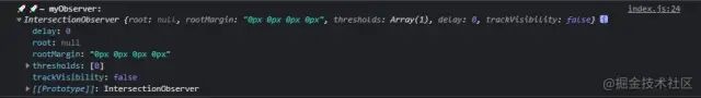 ((doc) => { //回调函数 const callback = () => {}; //配置对象 const options = {}; //创建观察器 const myObserver = new IntersectionObserver(callback, options); //获取目标元素 const target = doc.querySelector(".target") //开始监听目标元素 myObserver.observe(target); console.log('🚀🚀~ myObserver:', myObserver);})(document)可以看到,我们的观察器实例上面包含如下属性