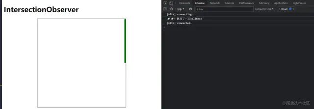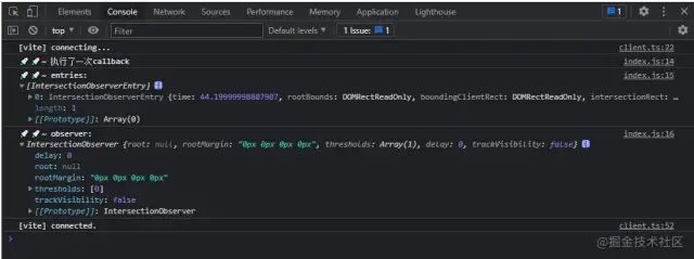 ((doc) => { //回调函数 const callback = () => { console.log('🚀🚀~ 执行了一次callback'); }; //配置对象 const options = {}; //观察器实例 const myObserver = new IntersectionObserver(callback, options); //目标元素 const target = doc.querySelector("#target") //开始观察 myObserver.observe(target);})(document)可以看到,无论目标元素是否与根元素相交,当我们第一次监听目标元素的时候,回调函数都会触发一次,所以不要直接在回调函数里写逻辑代码,尽量通过 isIntersecting 或者 intersectionRect 进行判断之后再执行逻辑代码。