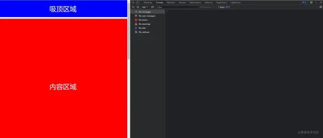 <template> <div class="box"> <div class="reference" ref='reference'></div> <div class="header" ref='header'>吸顶区域</div> <div class="vbody">内容区域</div> <div class="vbody">内容区域</div> <div class="vbody">内容区域</div> </div></template><script lang='ts'>import { defineComponent, onMounted, ref } from 'vue'export default defineComponent({ name: '', setup() { const header = ref(null) const reference = ref(null) onMounted(() => { //回调函数 const callback = (entries) => { const myEntry = entries[0] if (!myEntry.isIntersecting) { console.log('🚀🚀~ 触发了吸顶') header.value.style.position = 'fixed' header.value.style.top = '0px' } else { console.log('🚀🚀~ 取消吸顶') header.value.style.position = 'relative' } } //配置对象 const options = { root: null, rootMargin: '0px 0px 0px 0px', threshold: [0, 1], trackVisibility: true, delay: 100, } //观察器实例 const myObserver = new IntersectionObserver(callback, options) //开始观察 myObserver.observe(reference.value) }) return { reference, header } },})</script><style>* { margin: 0; padding: 0; box-sizing: border-box;}.header { width: 100%; height: 100px; background-color: blue; color: aliceblue; font-size: 40px; text-align: center; line-height: 100px;}.reference { width: 100%; visibility: hidden;}.vbody { width: 100%; height: 800px; background-color: red; color: aliceblue; font-size: 40px; text-align: center; line-height: 800px; margin: 10px 0;}</style>思路就是利用一个参考元素作为交叉观察器观察的对象,当参考元素可见的时候,取消吸顶区域的 fixed 属性,否则添加 fixed 属性,吸底稍微复杂一点,但是道理差不多,留给小伙伴们自行研究吧 ~ ~。