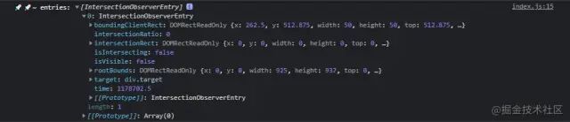((doc) => { //回调函数 const callback = (entries, observer) => { console.log('🚀🚀~ 执行了一次callback'); console.log('🚀🚀~ entries:', entries); console.log('🚀🚀~ observer:', observer); }; //配置对象 const options = {}; //创建观察器 const myObserver = new IntersectionObserver(callback, options); //获取目标元素 const target = doc.querySelector(".target") //开始监听目标元素 myObserver.observe(target);})(document)我们把这两个参数打印出来看一下,可以看到,第一个参数是一个数组,每一项都是一个目标元素对应的 IntersectionObserverEntry对象,第二个参数是观察器实例对象 IntersectionObserver 。