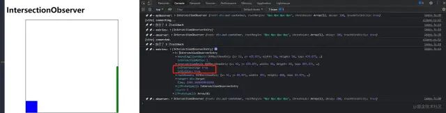 css 属性 为 opacity: 0,可以看到,虽然我们蓝色小方块并没有出现在视图中,但是回调函数已经执行了,并且 isVisible 属性值为 false 而 isIntersecting 值为 true 。delay 回调函数延迟触发,我们修改
