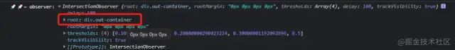 ((doc) => { let n = 0 //获取目标元素 const target = doc.querySelector(".target") //获取根元素 const root = doc.querySelector(".out-container") //回调函数 const callback = (entries, observer) => { n++ console.log(`🚀🚀~ 执行了 ${n} 次callback`); console.log('🚀🚀~ entries:', entries); console.log('🚀🚀~ observer:', observer); }; //配置对象 const options = { root: root, rootMargin: '0px 0px 0px 0px', threshold: [0.5], trackVisibility: true, delay: 100 }; //创建观察器 const myObserver = new IntersectionObserver(callback, options); //开始监听目标元素 myObserver.observe(target); console.log('🚀🚀~ myObserver:', myObserver);})(document)root 这个没什么说的,就是设置指定节点为根元素 rootMargin 我们把