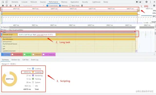从图中看到计算过程的 Long Task 执行时间为 35.45s, 是造成页面假死的原因