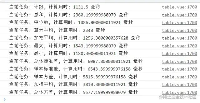 <template> <div> <button @click="makeWorker">开始线程</button> <!--在计算时 往input输入值时 没有发生卡顿--> <p><input type="text"></p> </div></template><script> import Worker from "worker-loader!./worker"; export default { data() { // 模拟数据 let arr = new Array(100000).fill(1).map(() => Math.random()* 10000); let weightedList = new Array(100000).fill(1).map(() => Math.random()* 10000); let calcList = [ {type: 'sum', name: '总和'}, {type: 'average', name: '算术平均'}, {type: 'weightedAverage', name: '加权平均'}, {type: 'max', name: '最大'}, {type: 'middleNum', name: '中位数'}, {type: 'min', name: '最小'}, {type: 'variance', name: '样本方差'}, {type: 'popVariance', name: '总体方差'}, {type: 'stdDeviation', name: '样本标准差'}, {type: 'popStandardDeviation', name: '总体标准差'} ] return { workerList: [], // 用来存储所有的线程 calcList, // 计算类型 arr, // 数据 weightedList // 加权因子 } }, methods: { makeWorker() { this.calcList.forEach(item => { let workerName = `worker${this.workerList.length}`; let worker = new Worker(); let start = performance.now(); worker.postMessage({arr: this.arr, type: item.type, weightedList: this.weightedList}); worker.addEventListener("message", (e) => { worker.terminate(); let tastName = ''; this.calcList.forEach(item => { if(item.type === e.data.type) { item.value = e.data.value; tastName = item.name; } }) let end = performance.now(); let duration = end - start; console.log(`当前任务: ${tastName}, 计算用时: ${duration} 毫秒`); }); this.workerList.push({ [workerName]: worker }); }) }, clearWorker() { if (this.workerList.length > 0) { this.workerList.forEach((item, key) => { item[`worker${key}`].terminate && item[`worker${key}`].terminate(); // 终止所有线程 }); } } }, // 页面关闭,如果还没有计算完成,要销毁对应线程 beforeDestroy() { this.clearWorker(); }, }</script>复制代码worker.js