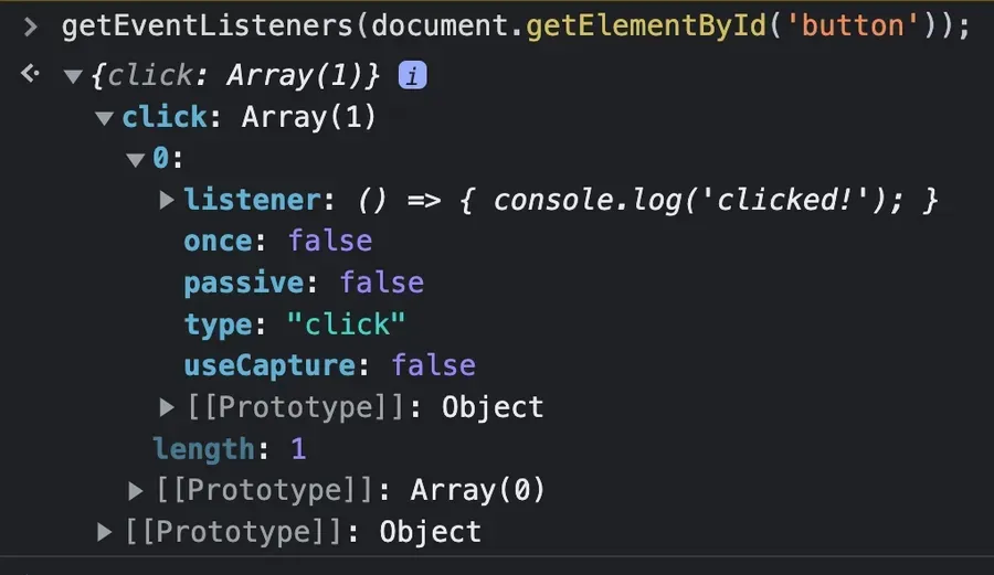 <button id="button">Do Something</button><script>document.getElementById('button').addEventListener('click', () => { console.log('clicked!');});</script>使用 Chrome getEventListeners() 函数,您将看到只有一个监听器附加到该元素: