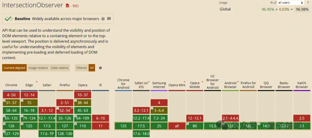 IntersectionObserver API 的浏览器兼容性总体上相当不错,但仍需要注意某些旧版浏览器和特定浏览器中的支持情况。以下是截至 2024 年的主要浏览器的兼容性概况: