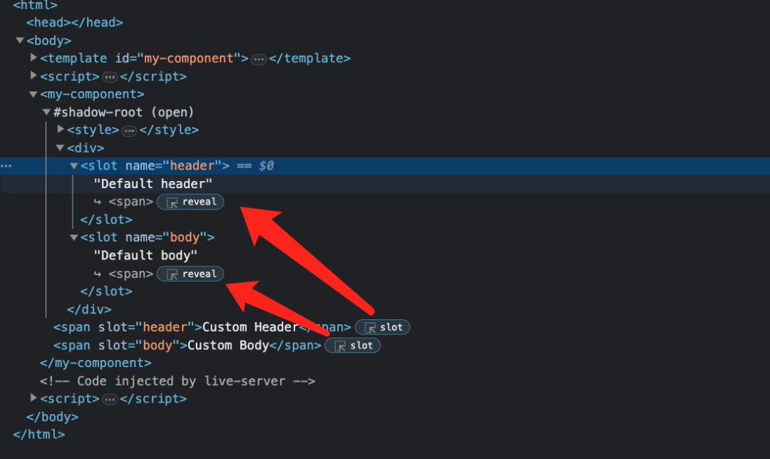 }毕竟本质上插槽重定位和 Shadow DOM slot 还是不一样。Shadow DOM 方案会隔离出 Light DOM 和 Shadow DOM 两个不同的空间,DOM 的操作互不干扰。