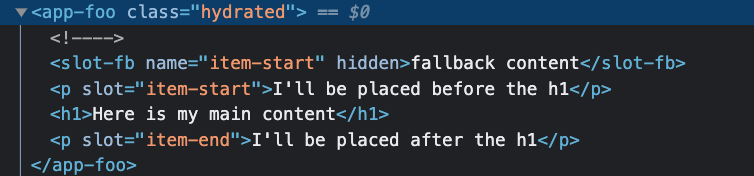 render(){ return( <my-component> <p slot="item-start">I'll be placed before the h1</p> <p slot="item-end">I'll be placed after the h1</p> </my-component> )}渲染结果: