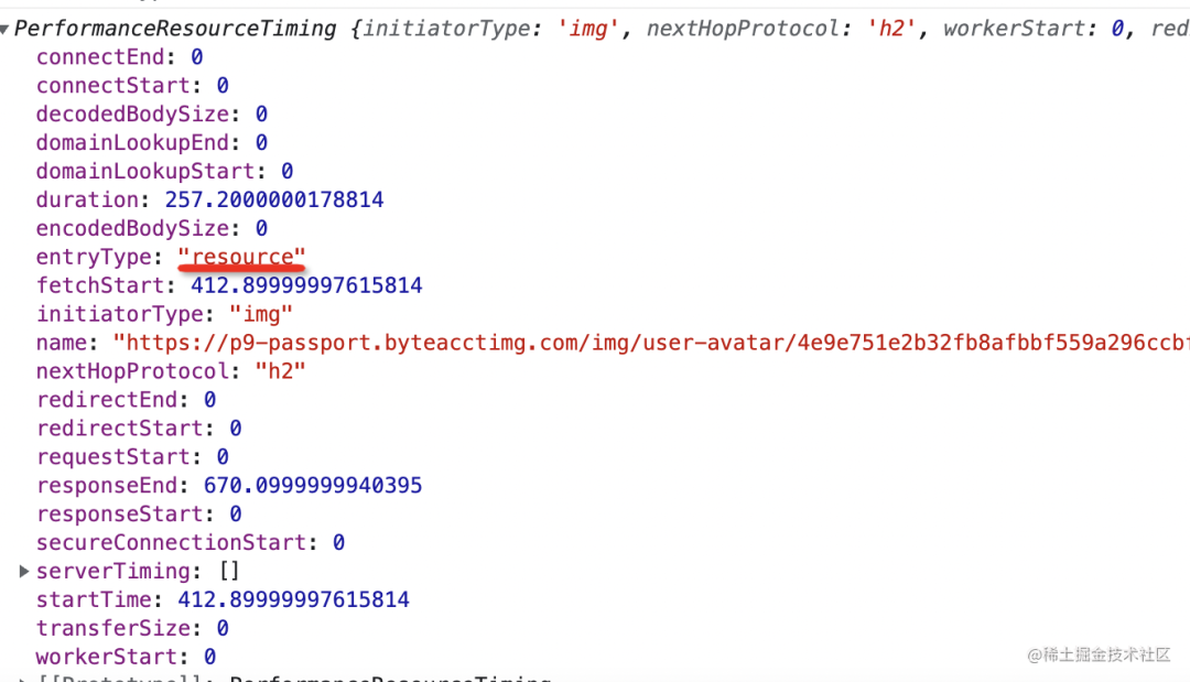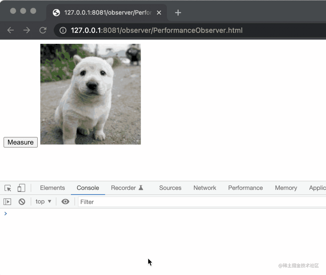 <html><body> <button onclick="measureClick()">Measure</button> <img src="https://p9-passport.byteacctimg.com/img/user-avatar/4e9e751e2b32fb8afbbf559a296ccbf2~300x300.image" /> <script> const performanceObserver = new PerformanceObserver(list => { list.getEntries().forEach(entry => { console.log(entry);// 上报 }) }); performanceObserver.observe({entryTypes: ['resource', 'mark', 'measure']}); performance.mark('registered-observer'); function measureClick() { performance.measure('button clicked'); } </script></body></html>创建 PerformanceObserver 对象,监听 mark(时间点)、measure(时间段)、resource(资源加载耗时) 这三种记录时间的行为。