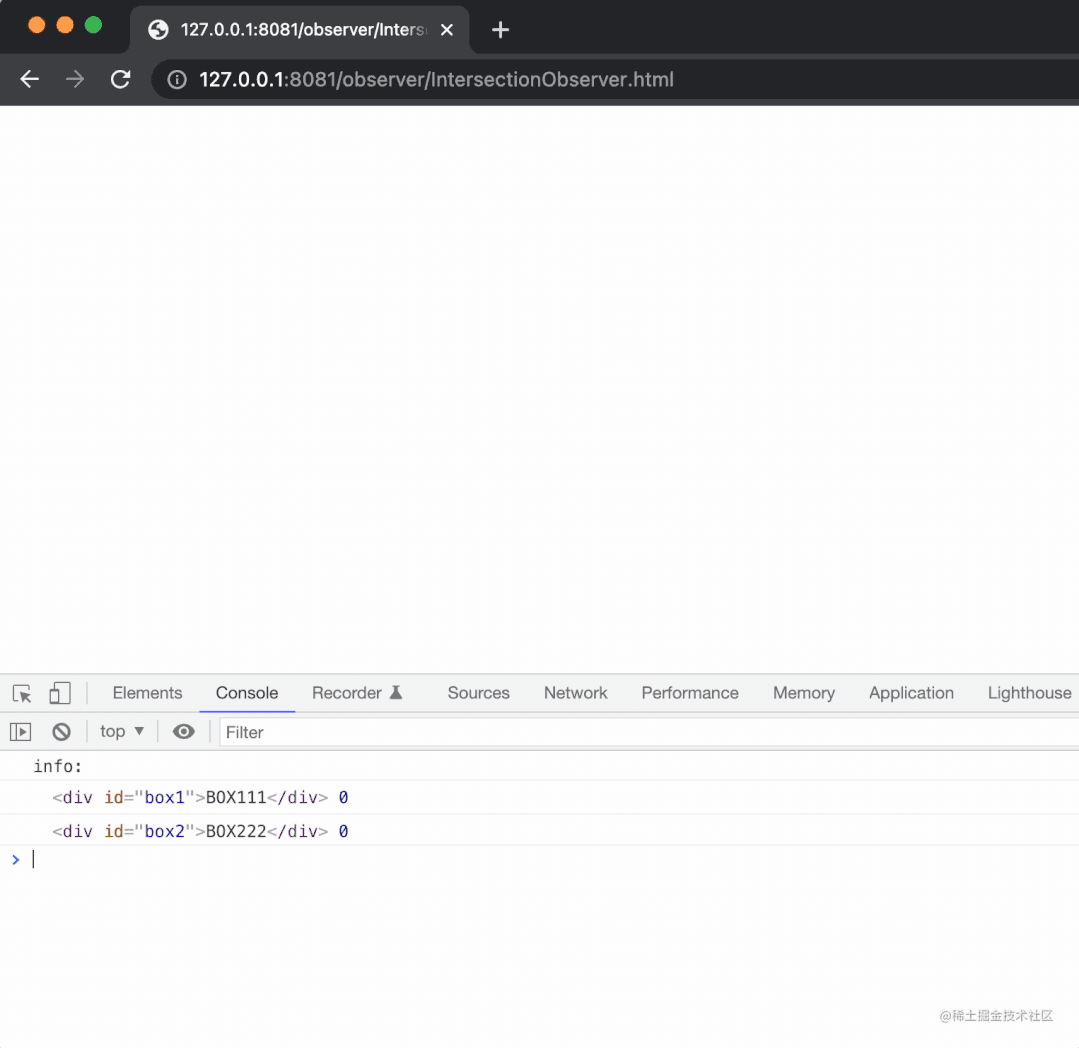 const intersectionObserver = new IntersectionObserver( function (entries) { console.log('info:'); entries.forEach(item => { console.log(item.target, item.intersectionRatio) }) }, { threshold: [0.5, 1]});intersectionObserver.observe( document.querySelector('#box1'));intersectionObserver.observe( document.querySelector('#box2'));创建一个 IntersectionObserver 对象,监听 box1 和 box2 两个元素,当可见比例达到 0.5 和 1 的时候触发回调。
