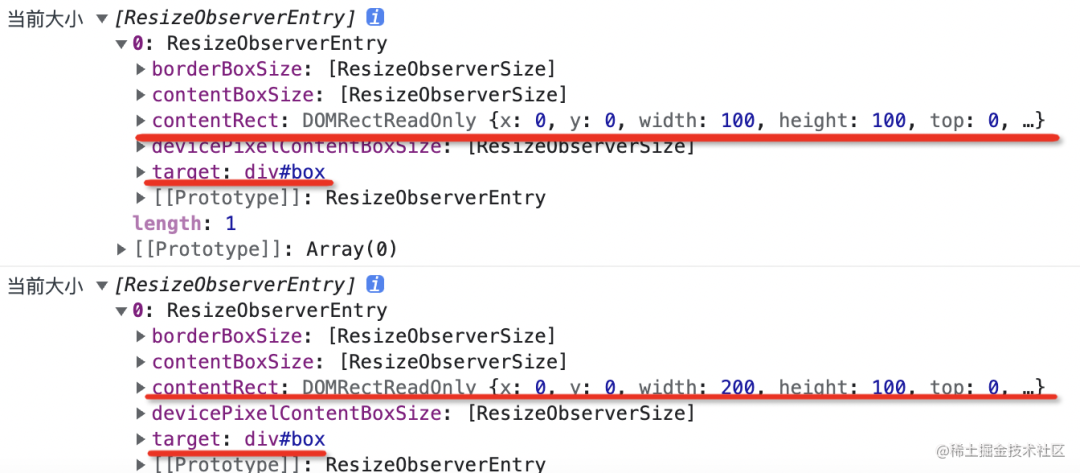 const resizeObserver = new ResizeObserver(entries => { console.log('当前大小', entries)});resizeObserver.observe(box);在浏览器跑一下: