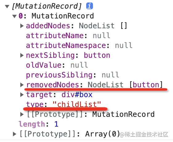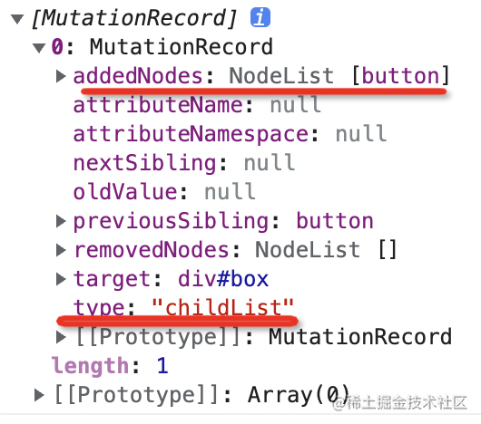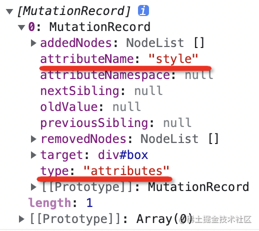 const mutationObserver = new MutationObserver((mutationsList) => { console.log(mutationsList)});mutationObserver.observe(box, { attributes: true, childList: true});创建一个 MutationObserver 对象,监听这个盒子的属性和子节点的变化。