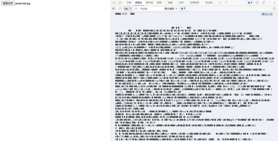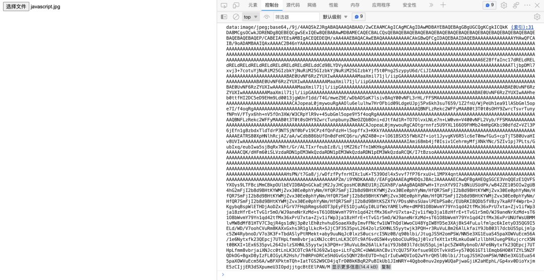 const fileInput = document.getElementById("fileInput");const reader = new FileReader();fileInput.onchange = (e) => { reader.readAsDataURL(e.target.files[0]);}reader.onload = (e) => { console.log(e.target.result);}这时,再次上传二进制图片时,就会在控制台打印一个 base64 编码的 URL,如下: