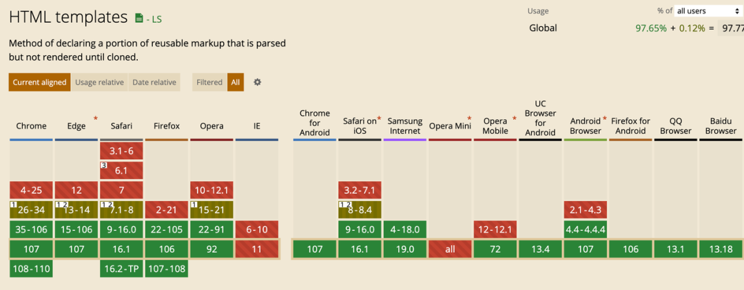 支持程度、存在问题、对应版本的浏览器在市场中的占比(不支持 IE)。