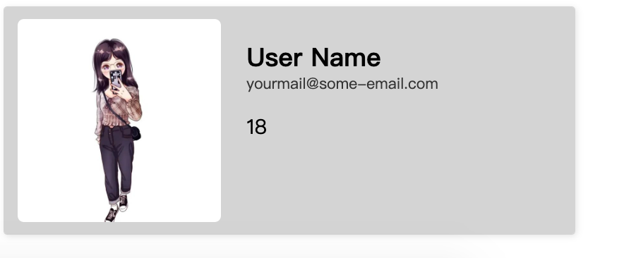 <!-- 人员信息卡片标签 --><user-card image="https://s1-imfile.feishucdn.com/static-resource/v1/v2_b2741d84-5d05-4739-b349-a3887b61039g~?image_size=noop&cut_type=&quality=&format=image&sticker_format=.webp" yourmail@some-email.com" age="18"></user-card><!-- 在HTML中定义template --><template id="userCardTemplate"> <style> .box { display: flex; align-items: center; width: 450px; height: 180px; background-color: #d4d4d4; border: 1px solid #d5d5d5; box-shadow: 1px 1px 5px rgba(0, 0, 0, 0.1); border-radius: 3px; overflow: hidden; padding: 10px; box-sizing: border-box; } .image { flex: 0 0 auto; width: 160px; height: 160px; vertical-align: middle; border-radius: 5px; } .container { box-sizing: border-box; padding: 20px; height: 160px; } .container > .name { font-size: 20px; font-weight: 600; line-height: 1; margin: 0; margin-bottom: 5px; } .container > .email { font-size: 14px; opacity: 0.75; line-height: 1; margin: 0; margin-bottom: 15px; } .container > .age { padding: 10px 25px; font-size: 14px; border-radius: 5px; text-transform: uppercase; } </style> <div class="box"> <img class="image" /> <div class="container"> <p class="name"></p> <p class="email"></p> <p class="age"></p> </div> </div></template>// UserTemplate.jsclass UserCard extends HTMLElement { constructor() { super(); var templateElem = document.getElementById("userCardTemplate"); var content = templateElem.content.cloneNode(true); content .querySelector(".image") .setAttribute("src", this.getAttribute("image")); content.querySelector(".name").innerText = this.getAttribute("name"); content.querySelector(".email").innerText = this.getAttribute("email"); content.querySelector(".age").innerText = this.getAttribute("age"); this.appendChild(content); }}window.customElements.define("user-card", UserCard);运行效果: