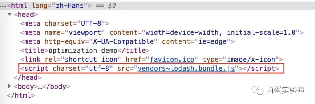 在上面的懒加载代码里,我们是点击按钮时,才会触发异步加载 lodash 的动作,这时候会动态的生成一个 script 标签,加载到 head 头里: