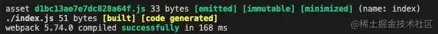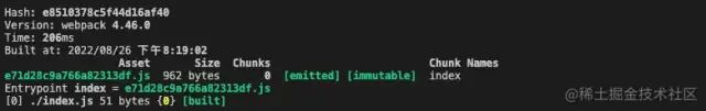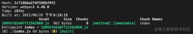 const path = require('path');module.exports = { mode: 'production', entry: { index: './index.js' }, output: { path: path.resolve(__dirname, './dist'), filename: '[contenthash].js', },}这里是要打包的 index.js 的内容