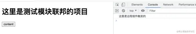 // 提供远程组件的项目webpack模块联邦设置new ModuleFederationPlugin({ name: 'RemoteComponent', library: { type: 'var', name: 'RemoteComponent' }, // 使用此远程组件加载的文件名称 filename: 'remoteEntry.js', exposes: { //此处提供了一个Button组件 './Button': './src/components/Button', },}),// 这是远程button组件import React from 'react';export default function Button({ content, onClick = () => {} }) { return ( <button onClick={onClick}>{ content }</button> )}实际效果