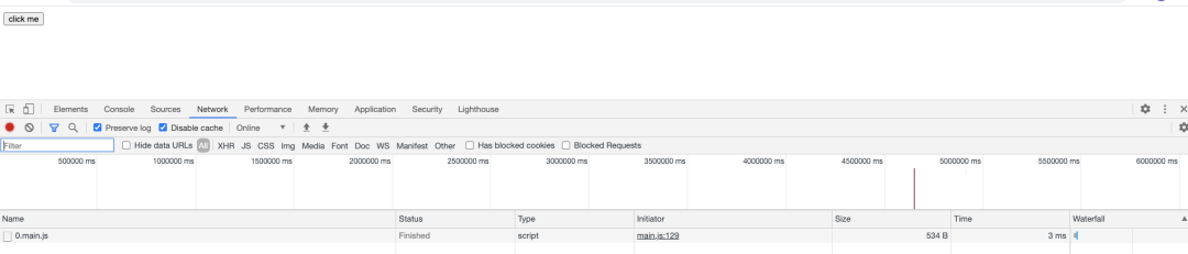 可以看到index.html加载以后资源加载以及代码的执行情况,会发现我们写的代码中的同步逻辑均已执行,接下来看看异步逻辑(点击按钮),这里为了效果,点击之前分别清空了Network和Console两个标签的内容