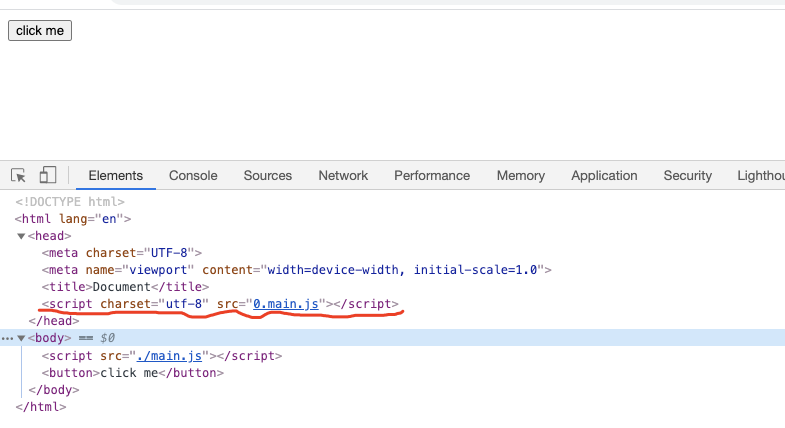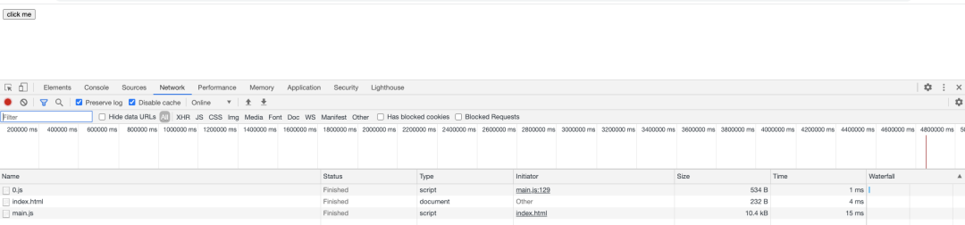 html中动态添加了一个script标签,引入了一个文件(0.main.js),然后发送两个一个http请求进行资源加载,加载成功以后在控制台输出一段日志。