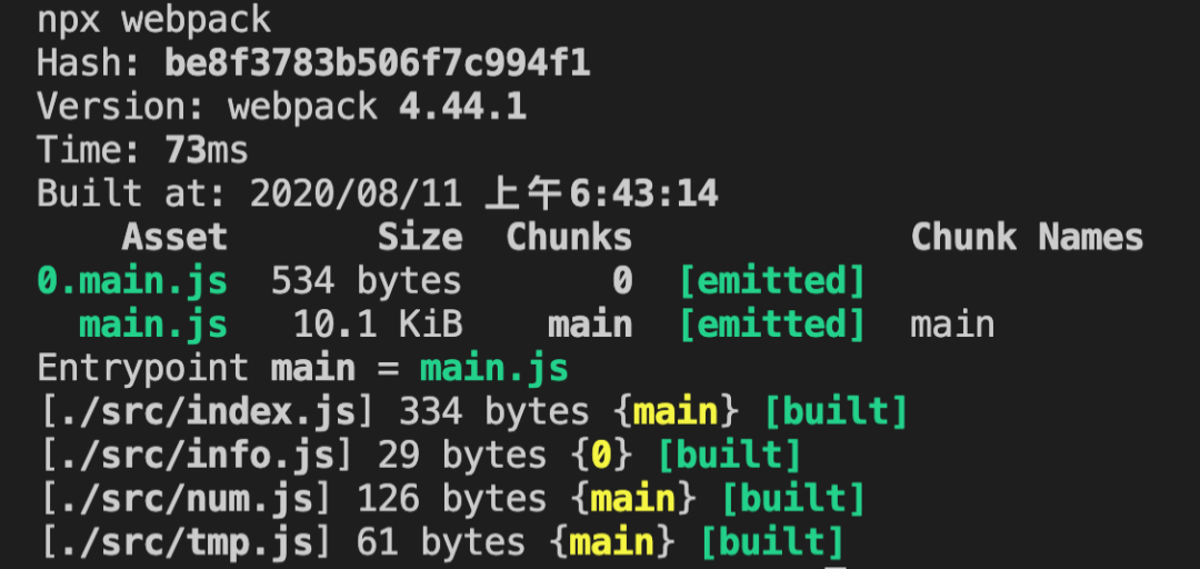npx webpack<br style="max-width: 100%;box-sizing: border-box !important;overflow-wrap: break-word !important;">会看到多了一个 dist 目录,且看输出结果,main.js大家肯定都知道是什么,这个是我们在webpack.config.js中配置的输出的文件名,但是0.main.js呢?这是什么?我们也没配置,可以先想一下,之后我们从代码中找答案