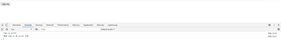 /** * 入口文件,引入 print 方法,并执行 * 定义了一个 button 方法,为页面添加一个按钮,并为按钮设置了一个 onclick 事件,负责动态引入一个文件 */import { print } from './num.js'print()function button () { const button = document.createElement('button') const text = document.createTextNode('click me') button.appendChild(text) button.onclick = e => import('./info.js').then(res => { console.log(res.log) }) return button}document.body.appendChild(button())/src/num.js