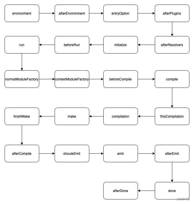 触发时机与 webpack 工作过程紧密相关,大体上从启动到结束,compiler 对象逐次触发如下钩子: